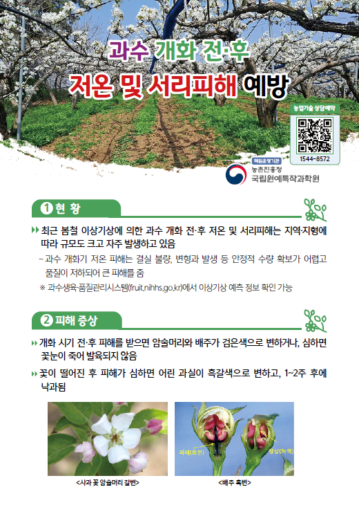 늦서리나 저온 피해가 우려되는 지역에서는 기상 예보를 수시로 확인하고, 피해를 최소화하기 위해 각 농가에서는 미세살수(물 뿌림) 장치나 방상 팬(서리방지 팬) 등 재해 예방 설비를 미리 점검해야 한다.